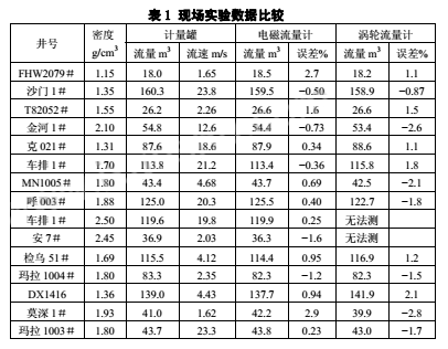 現(xiàn)場試驗(yàn)所用測量管的內(nèi)徑為DN50,通過高壓由壬接入泥漿管線,并串接渦輪流量計(jì)進(jìn)行比較,采用標(biāo)準(zhǔn)計(jì)量罐測試。計(jì)量鉆井泥漿密度范圍為1.15g/cm³~2.50g/cm³,固井設(shè)計(jì)施工現(xiàn)場一次性替漿量為18m³~160m³,替漿瞬時(shí)流量為0.2m³/min~2.8m³/min(流速:1.6~23.8m/s);通過近15口井的施工應(yīng)用,結(jié)果如表1所示。試驗(yàn)表明儀表計(jì)量誤差小于1%;在流速2.0m/s以下,隨著流量的減少測試誤差逐漸提高,在流速1.0m/s左右計(jì)量精度降到3%左右。經(jīng)分析,主要是由零點(diǎn)漂移引起的,這點(diǎn)與實(shí)驗(yàn)室用清水標(biāo)定結(jié)果基本吻合。使用DN50的測量管,實(shí)驗(yàn)室標(biāo)定結(jié)果如表2所示。試驗(yàn)證明,采用雙頻矩形波作為勵(lì)磁信號,可有效地規(guī)避和抑止固井泥漿的流動噪聲和現(xiàn)場震動等所帶來的低頻噪聲,從而顯著提高儀表計(jì)量泥漿的精度。