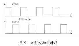 該電路主要由勵(lì)磁時(shí)序發(fā)生單元、三態(tài)緩沖器及隔離光耦組成。勵(lì)磁時(shí)序由印染污水流量計(jì)系統(tǒng)的控制核心產(chǎn)生。采用DSP的EPWM外設(shè)模塊,通過設(shè)定其內(nèi)部定時(shí)器的工作模式發(fā)出所要求的勵(lì)磁頻率的勵(lì)磁時(shí)序PWM信號(hào)CT_1和CT_2。由于勵(lì)磁控制系統(tǒng)中的勵(lì)磁工作電源的電壓要比DSP的工作電源電壓高得多,為防止勵(lì)磁電路故障對(duì)系統(tǒng)控制核心產(chǎn)生致命影響,采用光耦將控制部分與勵(lì)磁部分進(jìn)行隔離。另外,由于DSP引腳的驅(qū)動(dòng)能力有限,所以在DSP與隔離光耦之間加入三態(tài)緩沖器以驅(qū)動(dòng)隔離光耦的輸入級(jí)。并且,DSP能夠通過GPIO口控制三態(tài)緩沖器上的使能引腳來使能和禁止勵(lì)磁,以在檢測(cè)到電路故障時(shí)迅速關(guān)斷H橋所有橋臂。該勵(lì)磁時(shí)序產(chǎn)生電路通過軟件編程可產(chǎn)生如圖5所示的單頻矩形波。在實(shí)際應(yīng)用中,由于組成H橋的達(dá)林頓三極管與MOS管導(dǎo)通與關(guān)斷的時(shí)間不一致,易在勵(lì)磁方向切換瞬間,產(chǎn)生上下橋臂同時(shí)導(dǎo)通的現(xiàn)象,反映在勵(lì)磁電流波形上為一幅值很高的窄脈沖。該脈沖電流不僅容易引起遲滯比較電路的誤輸出,從而導(dǎo)致高低壓切換電路與電流旁路電路的誤動(dòng)作,而且對(duì)恒流控制電路產(chǎn)生沖擊,減小三端穩(wěn)壓芯片的使用壽命,同時(shí)還會(huì)產(chǎn)生EMC電磁干擾,給測(cè)量精度帶來影響。所以實(shí)際應(yīng)用時(shí),如圖5所示對(duì)方波勵(lì)磁時(shí)序添加死區(qū),可以明顯減小上述現(xiàn)象。