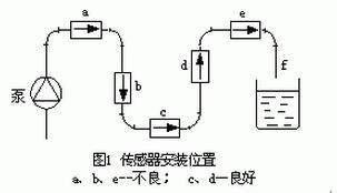 水平安裝時(shí)要使電極軸線平行于地平線,不要處于垂直于地平線,因?yàn)樘幱诘撞康碾姌O易被沉積物覆蓋,頂部電極易被液體中偶存氣泡擦過(guò)遮住電極表面,使輸出信號(hào)波動(dòng)。圖1所示管系中,c、d為適宜位置;a、b 、e為不宜位置,b處可能液體不充滿(mǎn),a、e處易積聚氣體,且e處傳感器后管段短也有可能不充滿(mǎn),排放口*好如f形狀所示。對(duì)于固、液兩相流c處亦是不宜位置。