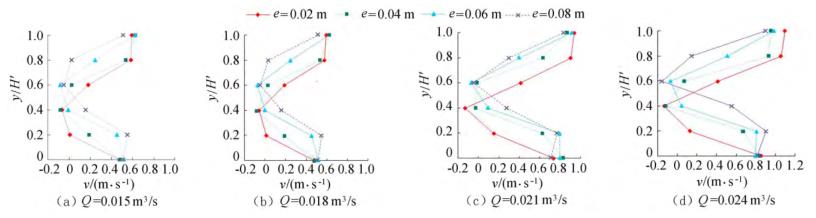 圖4橫坐標為斷面水流方向流速,縱坐標為測點垂向位置與下游水位的比值y/H'。隨著浮體結(jié)構(gòu)位置的上升,*小斷面流速位置同樣上升。以圖3(a)為例,當e=0.02m時,下游斷面位置自下而上呈現(xiàn)先減小、后增大的趨勢,在y/H'=0.40時流速達到*小,隨著浮體結(jié)構(gòu)位置的上升,*小流速呈現(xiàn)向上偏移的趨勢。在斷面位置y/H'=0.20時,隨著e的增大,流速呈現(xiàn)增大的趨勢。當e較小時,流經(jīng)浮體結(jié)構(gòu)下部進行下泄的水流較少,主流出現(xiàn)在浮體結(jié)構(gòu)的上部,且在浮體結(jié)構(gòu)的阻擋作用下出現(xiàn)回流區(qū);隨著e上升,主流偏向浮體結(jié)構(gòu)下部區(qū)域,流速增大。與y/H'=0.20的流速分布正好相反,當y/H'=0.80時,流速分布隨著浮體位置的增大而減小。隨著e的增大,通過浮體結(jié)構(gòu)下部泄流的水體增多,主流開始向下偏移。試驗過程中,浮體結(jié)構(gòu)處于淹沒狀態(tài),流速的分布隨著浮體位置的改變呈現(xiàn)上大、中小、下大的分布趨勢,在浮體結(jié)構(gòu)下游區(qū)域形成回流區(qū),回流區(qū)的位置隨著浮體結(jié)構(gòu)的上升而上升。