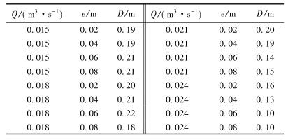 表3中,當來流流量較小時(Q=0.015m3/s),回流區(qū)的長度D隨著浮體結(jié)構(gòu)位置的增大逐漸增大;當來流流量較大時(Q=0.024m3/s),回流區(qū)的長度卻隨著浮體結(jié)構(gòu)位置的增大呈現(xiàn)減小的趨勢。試驗過程中,當浮體結(jié)構(gòu)位置較高且來流較小時,浮體結(jié)構(gòu)上下部區(qū)域的主流流速較小,回流區(qū)范圍較大;浮體結(jié)構(gòu)位置不變時,來流流量增大,回流區(qū)長度減小。來流增加,下泄水流流速較大,并迅速將回流區(qū)內(nèi)的水流帶入下游區(qū)域,因此回流區(qū)長度反而呈現(xiàn)減小趨勢。