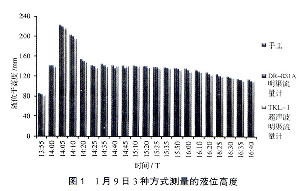 見圖3,以手工實(shí)測液位高度為基準(zhǔn),2種流量計(jì)的誤差均在±5%的范圍內(nèi)。除在1月9日14∶40和14∶45兩個時間點(diǎn)測量值表現(xiàn)出DR-831A測量誤差高于TKL-Ⅰ外,其他時段都明顯表現(xiàn)出DR-831A測量誤差小于TKL-Ⅰ。