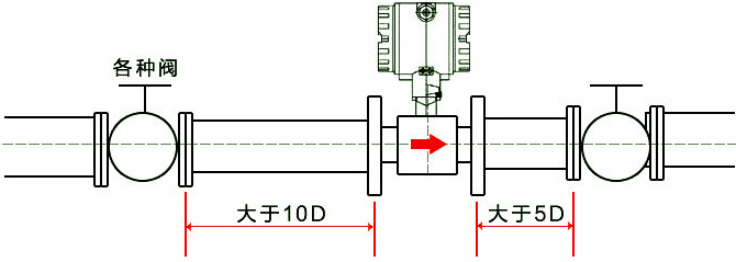 1、安裝時液體流動方向應(yīng)與傳感器外殼上指示流向的箭頭方向一致,且上游直管段應(yīng)≥20dn,下游直管段應(yīng)≥5dn,其中dn為管道內(nèi)徑。