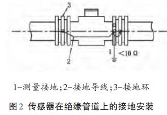 傳感器安裝在塑料管道或內(nèi)壁有絕緣涂層、襯里的管道上,兩端應(yīng)安裝接地環(huán)(或帶有接地電極的金屬短管),然后用導(dǎo)線連接,使管內(nèi)流動(dòng)的介質(zhì)與大地短路,具有零電位(見圖2)。
