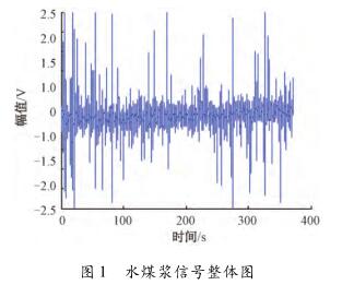 針對反應釜冷水流量計測量水煤漿時出現(xiàn)較大波動,甚至回零這一問題,特去某煤化工企業(yè)甲醇分公司進行現(xiàn)場數(shù)據(jù)采集。該公司所使用的對置式四噴嘴氣化有4個噴嘴,噴嘴管道口徑為125mm,管中水煤漿流量基本穩(wěn)定在19m³/h(流速約為0.48m/s)。每條噴嘴煤漿線上安裝了3臺反應釜冷水流量計,每臺反應釜冷水流量計由傳感器和變送器兩部分組成。選擇其中1條水煤漿管線上的1臺反應釜冷水流量計進行數(shù)據(jù)采集,因為該臺反應釜冷水流量計測量結果波動大,甚至出現(xiàn)回零的現(xiàn)象。將課題組研制的基于DSP的電磁流量變送器的信號線和勵磁線接到該電磁流量傳感器的電極和勵磁線圈上,組合成完整的反應釜冷水流量計,進行水煤漿數(shù)據(jù)采集。使用的電磁流量變送器是以TI公司DSP芯片TMS320F28335為核心,采用高頻勵磁方案,其硬件主要包括勵磁控制系統(tǒng)和信號采集處理系統(tǒng),具體的模塊有勵磁驅動模塊、信號調理采集模塊、信號處理控制模塊、人機接口模塊、通信模塊及電源管理模塊。信號調理采集模塊中的調理電路對一次儀表輸出的信號進行放大和濾波,截止頻率是2kHz,放大倍數(shù)約為230倍。通過NI公司USB-6216型號的數(shù)據(jù)采集卡進行數(shù)據(jù)采集,把調理電路的輸出端連接到數(shù)據(jù)采集卡的一個差分輸入端,并設置數(shù)據(jù)采集卡工作在差分的測量模式,設置采集卡的采樣頻率為10kHz。采集多組水煤漿信號數(shù)據(jù),每組數(shù)據(jù)的時間長度為5min。