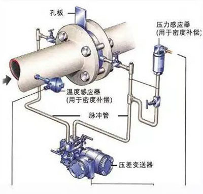 通過引壓管將差壓信號引入差壓變送器,差壓變送器將差壓信號送入流量積算儀,積算儀將差壓信號換算成流量信號。同時通過溫度和壓力傳感器測出蒸汽的溫度和壓力,積算儀根據(jù)當(dāng)時的溫度和壓力計算出補償后的流量。