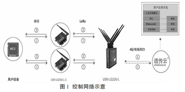 基于 LoRa 技術(shù)的無(wú)線流量計(jì)由控制,計(jì)量,通信,電源,存儲(chǔ)五個(gè)模塊組成。以液體流量計(jì)為主體的計(jì)量模塊將采集到的供暖管道數(shù)據(jù)發(fā)送到通信模塊,基于 LoRa 技術(shù)的通信模塊將流量數(shù)據(jù)存儲(chǔ)并且發(fā)送到由管理人員監(jiān)控的控制模塊,管理人員通過(guò)控制模塊和通信模塊向流量計(jì)發(fā)送指示。電源模塊是無(wú)線流量計(jì)的能源中心,可以為流量計(jì)的其他模塊提供動(dòng)力支持。流量計(jì)安裝完畢后可在小區(qū)內(nèi)形成控制網(wǎng)絡(luò),網(wǎng)絡(luò)示意圖如圖 1 所示。