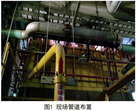 考慮兩臺機組管線布置和運行狀態(tài)完全一致, 下面僅提供#1機組的測量分析。圖1中頂軸油管上 部水平管道為凝結(jié)水補水管道。