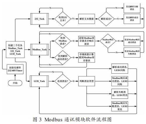 圖 3 為 Modbus 通訊模塊的軟件流程圖,創(chuàng)建的三個任務都是以 FreeRTOS 系統(tǒng)的消息(Message)來驅動。