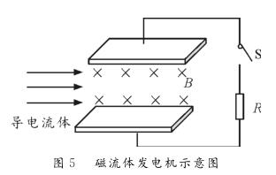 【例1】圖5為磁流體發(fā)電機示意圖。設兩金屬板間的距離為d,兩極板間勻強磁場的磁感應強度為B。等離子體垂直進入磁場的速度為v,單個離子所帶的電荷量為q。離子通道(即兩極板內(nèi)所圍成的空間)的等效電阻為r,負載電阻為R。則下列判斷正確的是( ?。?br /> A。該發(fā)電機的電動勢E=Bdv