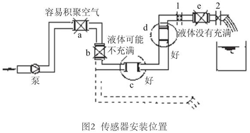 液體流動(dòng)方向必須與傳感器殼體上箭頭方向一致。對(duì)于能正反向測量的智能電磁流量計(jì),若方向不一致雖仍可測量,但設(shè)定的顯示流動(dòng)正反方向不符,必須改正之。若拆傳感器工作量大,也可改變傳感器上箭頭方向和重新設(shè)定顯示儀表符號(hào)。管道未充滿液體主要是管網(wǎng)工程設(shè)計(jì)或傳感器安裝位置不妥,使傳感器測量管內(nèi)不能充滿液體。應(yīng)采取措施,避免安裝如圖2所示a,e位置和以虛線管排放時(shí)b位置,改裝到c,d位置。