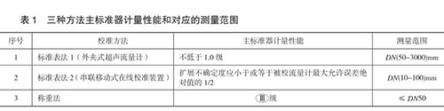 本規(guī)范包含三種校準方法,分別為標準表法 1(外夾式超聲流量計)、標準表法 2(串聯(lián)移動式在線校準裝置)和稱重法,編制組對每種方法進行了大量的實驗,并積極與智能電磁流量計生產(chǎn)廠家及用戶溝通探討,積累了豐富的經(jīng)驗,獲得了大量的實驗數(shù)據(jù),*終確定三種方法的主標準器計量性能和對應的測量范圍,如表 1 所示。