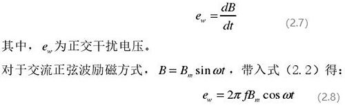 從上圖 2.5 中可以觀察到兩個(gè)電極、勵(lì)磁線(xiàn)圈、轉(zhuǎn)換器內(nèi)阻之間形成了一個(gè)閉合回路,將此回路稱(chēng)之為初級(jí)繞組,從理論上進(jìn)行分析,磁力線(xiàn) B 應(yīng)當(dāng)平行于勵(lì)磁線(xiàn)圈所產(chǎn)生的磁感應(yīng)線(xiàn),但在實(shí)際的應(yīng)用過(guò)程中由于工藝差異,因此無(wú)法達(dá)到理想狀態(tài),會(huì)產(chǎn)生磁力線(xiàn)穿過(guò)勵(lì)磁線(xiàn)圈磁感應(yīng)線(xiàn)的情況,此時(shí)將會(huì)產(chǎn)生相應(yīng)的感應(yīng)電動(dòng)勢(shì),將此部分感應(yīng)電動(dòng)勢(shì)稱(chēng)為變壓器效應(yīng)。此效應(yīng)同樣滿(mǎn)足于楞次定律,利用楞次定律進(jìn)行計(jì)算可得如下電動(dòng)勢(shì):