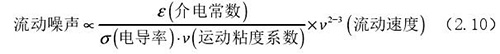 流動(dòng)噪聲主要出現(xiàn)在低電導(dǎo)率流體的檢測(cè)中,由輸出端輸出的直流極化電壓時(shí)常出現(xiàn)左右擺動(dòng)的現(xiàn)象,而此種擺動(dòng)的電壓被稱(chēng)為流動(dòng)噪聲。上式(2.5)中可以觀察了解到流體電導(dǎo)率和流動(dòng)噪聲呈現(xiàn)出負(fù)相關(guān)關(guān)系,由此可以了解到在進(jìn)行低電導(dǎo)率的計(jì)算中需要重點(diǎn)考慮位移電流。