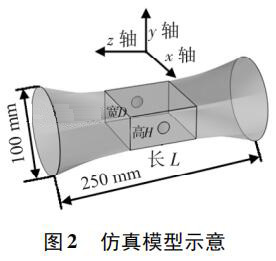 使用 Pro /E 軟件建立三維幾何模型,導(dǎo)入 COMSOL 軟件進(jìn)行有限元求解。仿真模型如圖 2 所示,電極連線為x 軸,連線中點為坐標(biāo)原點,流體運(yùn)動方向為 z 軸,傳感器管道口徑為 DN100,總長250 mm。異徑管部分初始結(jié)構(gòu)尺寸 L = 80 mm,D = 80 mm,H = 40 mm,圓形電極半徑為17 mm,伸出絕緣襯里的*大距離為 1. 5 mm。