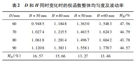 計算多組相同 D × H、不同 L 時 xy 平面的權(quán)函數(shù)整體均勻度 R 及波動率 ML,如表 1 所示。
