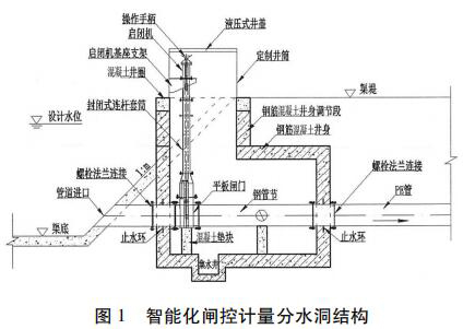 分水洞采用了一種封閉式啟閉閘集成閘井預(yù)制件,包括頂節(jié)、標(biāo)準(zhǔn)節(jié)和底座。與傳統(tǒng)現(xiàn)場(chǎng)澆筑的方式相比,集成閘井采用防水設(shè)計(jì),并且安裝更加方便快捷,很大程度上提高了安裝效率,節(jié)約成本。采用事先預(yù)制好的啟閉閘支座、啟閉機(jī)機(jī)座,保證了設(shè)備的安裝精度,提高了設(shè)備運(yùn)行的穩(wěn)定性,減少了設(shè)備的后期維護(hù)。分水洞結(jié)構(gòu)除了預(yù)制混凝土外,還可考慮采用玻璃鋼或工程塑料整體制作,用標(biāo)準(zhǔn)節(jié)調(diào)節(jié)高度。分水洞結(jié)構(gòu)設(shè)計(jì)見(jiàn)圖 1。