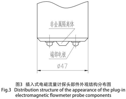 通過大量的試驗,對探頭端部外型結(jié)構(gòu)亦采用特殊設(shè)計,從而消除兩個電極之間的擾流現(xiàn)象,同時亦消除因通電產(chǎn)生磁場,導(dǎo)致兩個電極吸附介質(zhì)中的鐵屑而影響測量精度和死區(qū)效應(yīng),增強了輸出信號的穩(wěn)定性,從而提高傳感器準(zhǔn)確度和抗干擾性。通過結(jié)構(gòu)的優(yōu)化設(shè)計,使用壽命更長,dn80泥漿流量計探頭局部,如圖 3 所示。