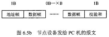 在測(cè)水流量計(jì)等節(jié)點(diǎn)設(shè)備和C機(jī)通信的過(guò)程中,由地址幀、命令幀、數(shù)據(jù)幀、校驗(yàn)和可組成各種功能不同的報(bào)文。由于采用主從工作方式來(lái)實(shí)現(xiàn)通信,測(cè)水流量計(jì)等節(jié)點(diǎn)設(shè)備僅能接收并執(zhí)行PC機(jī)發(fā)送來(lái)的控制命令,而不能發(fā)送命令給PC機(jī)。因此,由PC機(jī)發(fā)往流量計(jì)等節(jié)點(diǎn)設(shè)備的報(bào)文一般包括一個(gè)地址幀,一個(gè)命令幀,若干個(gè)數(shù)據(jù)幀和一個(gè)校驗(yàn)和,其報(bào)文格式圖.6a5所示;而由流量計(jì)等節(jié)點(diǎn)設(shè)備發(fā)往PC機(jī)的報(bào)文一般包括一個(gè)地址幀,若干個(gè)數(shù)據(jù)幀和一個(gè)校驗(yàn)和,其報(bào)文格式如圖6.5b所示。
