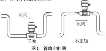測量流向取決于高壓電磁流量計的安裝方位,將高壓電磁流量計在接頭上旋轉(zhuǎn) 180 度即可反向。正流向時,高壓電磁流量計的突耳應(yīng)在上游方向。流量顯示總是正的,而累加器可以根據(jù)流向增加或者減少。安裝中確認管路設(shè)計不允許在介質(zhì)中產(chǎn)生氣泡或空腔,否則將引起測量誤差(見圖 5)。