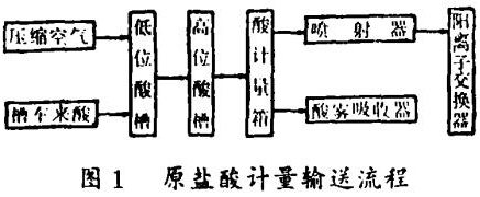 用陽離子交換樹脂制水要用酸作為再生劑。國內電廠多選用鹽酸。鹽酸用傳統(tǒng)的箱式計量方法,使系統(tǒng)操作復雜,安全性能降低,還會嚴重污染環(huán)境。一種用管道式流量計代替鹽酸計量箱的負壓輸送鹽酸系統(tǒng)能克服上述缺點。該系統(tǒng)自運行以來,使用情況良好,維護方便,受到工人們的歡迎。