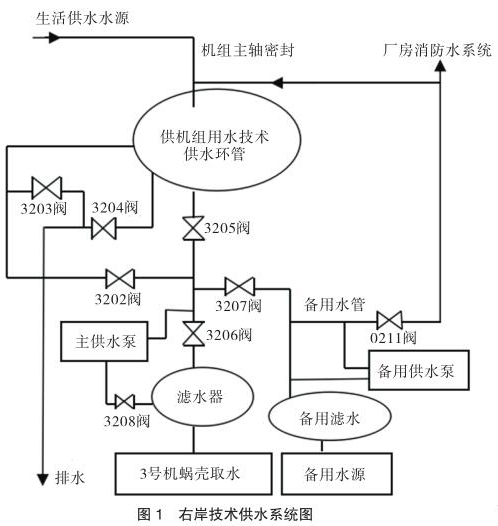 大化電廠(chǎng)技術(shù)供水包括右岸和左岸供水,本文以右岸 3 號(hào)機(jī)技術(shù)供水系統(tǒng)增設(shè)帶現(xiàn)場(chǎng)顯示航空煤油流量計(jì)技術(shù)改造方案為例進(jìn)行分析說(shuō)明。右岸技術(shù)供水系統(tǒng)(見(jiàn)圖 1)由各機(jī)組單元蝸殼取水主水源、濾水器、主供水泵、正反向切換閥(3202 閥與 3204 閥開(kāi)為反向取水,3203 閥與 3205閥開(kāi)為正向取水,運(yùn)行時(shí)只開(kāi)其中一種)、備用水源、備用濾水器、備用供水泵和備用總水管構(gòu)成一個(gè)整體,并通過(guò) 0211 閥與廠(chǎng)房消防水系統(tǒng)相連接,可通過(guò)主水源自流供水、主水源水泵增壓供水、備用水源自流供水、備用水源水泵增壓供水等不同供水方式向機(jī)組推力軸承冷卻器和發(fā)導(dǎo)軸承冷卻器、水導(dǎo)軸承冷卻器、發(fā)電機(jī)空氣冷卻器提供冷卻水源。機(jī)組技術(shù)供水正常運(yùn)行采用單元蝸殼取水的供水方式運(yùn)行,以備用水源供水為輔。機(jī)組主軸密封用水分別取自生活供水水源和技術(shù)供水備用總管水源,向機(jī)組大軸提供可調(diào)水壓端面密封水源。在現(xiàn)場(chǎng)配置一個(gè)技術(shù)供水現(xiàn)地單元柜,實(shí)現(xiàn)對(duì)機(jī)組技術(shù)供水系統(tǒng)設(shè)備自動(dòng)控制、故障保護(hù)及報(bào)警。柜內(nèi)配置可編程 PLC 控制系統(tǒng),電控柜對(duì)主供增壓泵、3202 至 3208 電動(dòng)碟閥進(jìn)行流程控制。