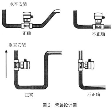 現(xiàn)場(chǎng)安裝時(shí)應(yīng)注意遠(yuǎn)離可能對(duì)其產(chǎn)生干擾的大型設(shè)備,防止長(zhǎng)期的熱輻射和其他如磁場(chǎng)直射等環(huán)境影響。為確保高測(cè)量精度和較好的零點(diǎn)穩(wěn)定性,進(jìn)行校正前,航空煤油流量計(jì)應(yīng)裝入工藝介質(zhì)中至少 24 小時(shí)電極鈍化。安裝的管路設(shè)計(jì)應(yīng)確保管道始終充滿(mǎn)流體,防止測(cè)量誤差,管路設(shè)計(jì)圖見(jiàn)圖 3。