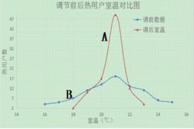 圖3中的曲線 A和B供熱管網(wǎng)智能蒸汽流量計調(diào)節(jié)前后的熱用戶室溫變化情況,橫坐標(biāo)表示室溫分布,縱坐標(biāo)表示熱用戶數(shù)量。從圖中可以看出,智能蒸汽流量計調(diào)節(jié)前熱用戶室溫比較分散,既有室溫小于18℃的熱用戶,也有室溫大于24℃的熱用戶。熱用戶室溫“近熱遠(yuǎn)冷”,供熱管網(wǎng)存在水力不平衡現(xiàn)象。智能蒸汽流量計調(diào)節(jié)后,有49戶用戶室溫在20℃~21℃之間,從圖中可以看出室溫分布范圍縮小,平均室溫降低,從而,不僅減少了供熱量,也大大提高了供熱品質(zhì)。一般來講,對采暖系統(tǒng),每增加 1℃平均室溫,能耗增多 5%~10%。采暖系統(tǒng)實現(xiàn)平衡后,常??梢越档推骄覝?℃~3℃。