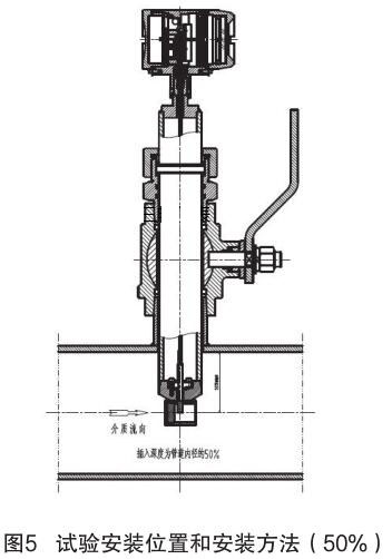 對(duì)插入式渦街流量計(jì)和插入式電磁流量計(jì)的結(jié)構(gòu)原理進(jìn)行分析,插入式電磁流量計(jì)的信號(hào)采集點(diǎn)在標(biāo)校管道內(nèi)12.5% 為宜,因它屬電磁類流量計(jì),而流量計(jì)是根據(jù)“卡門渦街”原理進(jìn)行測量管道內(nèi)流量,根據(jù)標(biāo)校管道內(nèi)層流和湍流的分析,以及流量計(jì)獨(dú)特的探頭結(jié)構(gòu)形式,確定煙氣流量計(jì)的插入深度為標(biāo)校管道內(nèi) 50%,試驗(yàn)安裝位置和安裝方法如圖 5 所示。