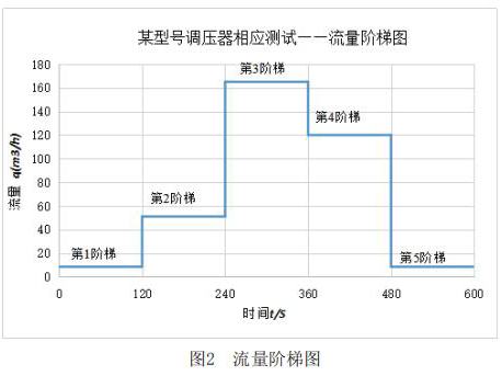 該測試主要利用實驗室測試條件,模擬客戶現(xiàn)場使用情況。其主要測試內(nèi)容包括:測試電磁流量計在+23℃,-30℃和-40℃三種溫度下,電磁流量計出口壓力分別在2.1kPa和30kPa時,流量分別從*1階梯到*5階梯時的響應(yīng)速度,客戶所提供的流量階梯如圖2所示。橫軸表示下游球閥開啟動作時間,縱軸表示衛(wèi)生級電磁流量計下游需要的流量q。