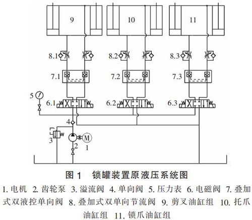 防爆型渦街流量計(jì)原液壓系統(tǒng)圖如圖 1 所示。 通過(guò)分析圖 1 發(fā)現(xiàn),原液壓系統(tǒng)中剪叉油缸組、托爪油缸組及鎖爪油缸組并聯(lián)安裝,并均由齒輪泵供油,該系統(tǒng)設(shè)計(jì)簡(jiǎn)單,液壓元件選擇不夠合理,工作效率低,電機(jī)發(fā)熱大,主要存在的問(wèn)題: