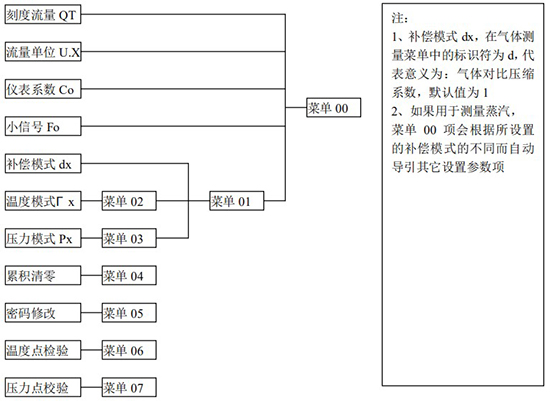 (3)標(biāo)況流量計(jì)算公式(若補(bǔ)償后單位為 U.0):(4)標(biāo)況流量計(jì)算公式(若補(bǔ)償后單位為 U.1):注:標(biāo)況指 20℃,1 標(biāo)準(zhǔn)大氣壓三、一體化液晶顯示表頭參數(shù)設(shè)置操作說(shuō)明(V03Z)1、鍵盤(pán)按鍵說(shuō)明2、 顯示窗字符說(shuō)明注:表中 x 代表“0”或“1”;Zn:標(biāo)準(zhǔn)狀態(tài)下(20℃,1 標(biāo)準(zhǔn)大氣壓),被測(cè)氣體的壓縮系數(shù),Z:工作狀態(tài)下被測(cè)氣體的壓縮系數(shù)3、 操作說(shuō)明3.1、本儀表表頭采用自導(dǎo)引式和菜單式相結(jié)合的參數(shù)設(shè)置方式,所謂自導(dǎo)引式參數(shù)設(shè)置方式就是用戶在進(jìn)入菜單 00 項(xiàng)后,表頭中的微電腦會(huì)自動(dòng)導(dǎo)引用戶去設(shè)置需要設(shè)置的參數(shù)。另外,用戶也可以通過(guò)菜單模式分別對(duì)各組參數(shù)進(jìn)行設(shè)置。蒸汽測(cè)量菜單框圖如下:3.2、參數(shù)設(shè)置約定:在設(shè)置各項(xiàng)參數(shù)時(shí),提示符閃動(dòng)代表該項(xiàng)參數(shù)沒(méi)有設(shè)置完或者尚未確認(rèn),可以通過(guò)按SET 鍵來(lái)確認(rèn)或者按→鍵退出;提示符不閃動(dòng)代表該項(xiàng)參數(shù)已設(shè)置完并確認(rèn),此時(shí)可以通過(guò)按 SET 鍵翻頁(yè)或者按→鍵退出。進(jìn)入?yún)?shù)設(shè)置時(shí),需要輸入密碼(6 位)并確認(rèn)進(jìn)入,為了防止誤進(jìn)入?yún)?shù)設(shè)置菜單,保證儀表正常工作,在設(shè)置密碼時(shí),使用↑鍵調(diào)數(shù)時(shí)不能循環(huán)調(diào)數(shù),只能單次調(diào)數(shù),只有密碼輸入正確進(jìn)入各項(xiàng)參數(shù)設(shè)置菜單后才可以對(duì)各位循環(huán)連續(xù)調(diào)整數(shù)據(jù)。3.3、儀表參數(shù)設(shè)置舉例:儀表出廠前各項(xiàng)參數(shù)已設(shè)置好,用戶無(wú)需設(shè)置。如果用戶需要設(shè)置某項(xiàng)參數(shù),請(qǐng)參照以下步驟,例如修改刻度流量值 QT:在工作狀態(tài)下,按 SET 鍵,顯示屏顯示 P,數(shù)字位為全零,8 秒鐘若無(wú)操作,自動(dòng)返回工作狀態(tài)。輸入密碼 :按數(shù)字↑鍵和左移←鍵,輸入密碼數(shù) xxxxx(出廠時(shí)默認(rèn)密碼為 000123),↑鍵調(diào)各位數(shù)字 0-9,每按 ←鍵一次數(shù)字向右循環(huán)一位,可通過(guò)多次按←鍵對(duì)整段數(shù)字清零,按→鍵可以返回工作狀態(tài)。菜單選擇項(xiàng):按 SET 鍵確認(rèn),顯示屏顯示如右圖所示,末行“00”閃動(dòng)調(diào)整該項(xiàng)值選擇不同參數(shù)設(shè)置菜單。該例直接按 SET 鍵進(jìn)入菜單 00 項(xiàng)設(shè)置刻度流量:QT 閃動(dòng),*一步:*先進(jìn)行小數(shù)點(diǎn)調(diào)整,可以通過(guò)←鍵對(duì)參數(shù)快速清零或者通過(guò)↑鍵進(jìn)行小數(shù)點(diǎn)調(diào)整,調(diào)整完畢,按 SET 鍵確認(rèn)(QT 仍閃動(dòng));*二步:數(shù)值調(diào)整,可以通過(guò)↑鍵對(duì)每位數(shù)字進(jìn)行調(diào)整,按 ←鍵一次數(shù)字向右移動(dòng)一位,調(diào)整完畢,按 SET 鍵確認(rèn),QT 停止閃動(dòng),該項(xiàng)參數(shù)設(shè)置完畢,可進(jìn)行下一項(xiàng)參數(shù)設(shè)置或者退出另外,單位設(shè)置 U.X 和補(bǔ)償方式設(shè)置 dX 通過(guò)↑鍵調(diào)整修改。3.4、校驗(yàn)項(xiàng)說(shuō)明: 儀表出廠前,溫度和壓力通道已校驗(yàn)設(shè)置好,無(wú)需用戶重新校驗(yàn)。校驗(yàn)通道有密碼保護(hù),廠家不對(duì)外開(kāi)放,如果需要重新校驗(yàn)溫度或者壓力通道,請(qǐng)專業(yè)人員與廠家技術(shù)人員聯(lián)系。4、計(jì)算公式說(shuō)明4.1、蒸汽測(cè)量計(jì)算公式(1)渦街流量?jī)x表工況體積流量計(jì)算公式:(2)密度 d,單位 Kg/m3(3)質(zhì)量流量計(jì)算公式,單位 Kg/h:(4)質(zhì)量流量計(jì)算公式,單位 t/h:4.2、氣體測(cè)量計(jì)算公式----標(biāo)況指 20℃,1 標(biāo)準(zhǔn)大氣壓(1)渦街流量?jī)x表工況體積流量計(jì)算公式:(2)對(duì)比壓縮系數(shù) d(Zn/Z),單位 1(3)標(biāo)況流量計(jì)算公式,單位 Nm3/h:P1—工況絕壓,PN—標(biāo)況絕壓(Mpa),T1—工況熱力學(xué)溫度,TN—標(biāo)況熱力學(xué)溫度(K)