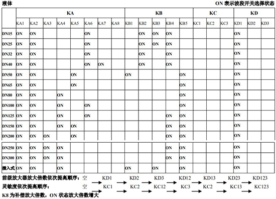 (4)標(biāo)況流量計(jì)算公式,單位 t/h:四、AMPKP09A01 放大板波段開(kāi)關(guān)調(diào)整參照表五、AMPSW10A01 放大板波段開(kāi)關(guān)調(diào)整參照表RG=1-F 調(diào)放大器增益,由 1 至 F 依次增大(常用 4-8);RS=1-F 調(diào)觸發(fā)靈敏度,由 1 至 F 依次提高(常用 4-8)不同口徑和介質(zhì)開(kāi)關(guān)選擇參見(jiàn)附表。并根據(jù)實(shí)際信號(hào)先調(diào)整 K2 和 K3 擴(kuò)展頻帶,必要時(shí)調(diào)整 K1 電荷放大器增益以上表值僅供參考,實(shí)際使用中因液體粘度和氣體密度不同應(yīng)在此值附近調(diào)整,頻率低時(shí)可將 K3 向大口徑方向調(diào)一至三檔。頻率高時(shí)可將 K2 向小口徑方向調(diào)一至三檔。訂貨須知及選型樣譜一.尊敬的用戶,當(dāng)您要選用本公司產(chǎn)品時(shí),請(qǐng)仔細(xì)閱讀選型樣本,并做好以下工作:1.認(rèn)真核對(duì)被測(cè)介質(zhì)的工況條件:溫度、壓力、管徑等工藝參數(shù)。2.認(rèn)真核對(duì)被測(cè)介質(zhì)的使用流量范圍,特別是*小流量值以*終確定使用儀表的口徑及配管參數(shù)。3.確定儀表的安裝地點(diǎn),保證直管段,并為儀表的安裝維護(hù)創(chuàng)造好的環(huán)境條件。4.填好訂貨咨詢單,見(jiàn)附表三二.渦街流量?jī)x表選型表(符合 JB/T9294-1999 標(biāo)準(zhǔn))1.傳感器選型表上一篇:污水流量計(jì)的種類
