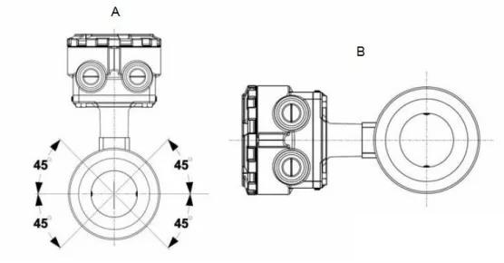 如果兩個測量電極處于 3 點(diǎn)鐘和 9 點(diǎn)鐘位置或與水平方向成 45 度以下角度,如 圖 3-4 左側(cè)所示,則傳感器電極的朝向正確。避免使傳感器的頂部與垂直位置成 90 度角(如 圖右側(cè)所示)的任何安裝朝向。