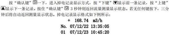 該記錄表示:*一條掉電記錄(No.1),停電時間為 07 年 12 月 22 日 13 點(diǎn) 35 分 05 秒,重新上電時間為 07 年 12 月 23 日 10 點(diǎn) 45 分 20 秒,掉電時的瞬時流量為 168.74m3/h,該次掉電時間長度為 21 小時 10 分鐘。