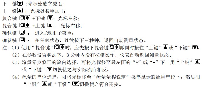 顯示中:上行“基準(zhǔn)”代表儀表零點(diǎn)的測量值,下行顯示是流量零點(diǎn)修正值。當(dāng)“基準(zhǔn)”顯示不為“0”時,應(yīng)調(diào)修正值使基準(zhǔn)=0。注意:若改變下行修正值,“基準(zhǔn)”值增加,需要改變下行數(shù)值的正、負(fù)號,使“基準(zhǔn)”能夠修正為零。