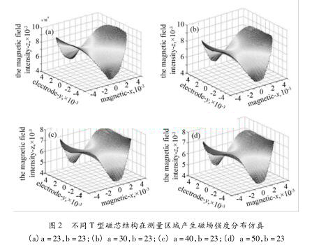仿真實(shí)驗(yàn)證明在有限的空間下,修改T磁芯的不同參數(shù),可以增加流量計(jì)測(cè)量區(qū)域內(nèi)部的磁場(chǎng)分布情況,也可以適當(dāng)?shù)恼{(diào)整流量計(jì)測(cè)量區(qū)域中的磁場(chǎng)強(qiáng)度與均勻度,根據(jù)生產(chǎn)測(cè)井中的實(shí)際工況,改變井水流量計(jì)的T磁芯參數(shù)獲得設(shè)計(jì)參數(shù)。