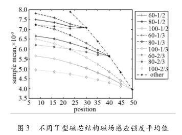 如圖3所示為不同T型磁芯結(jié)構(gòu)下測(cè)量區(qū)域產(chǎn)生磁場(chǎng)感應(yīng)強(qiáng)度平均值,圖中橫坐標(biāo)為T型磁芯b的角度,縱坐標(biāo)為測(cè)量區(qū)域的平均磁場(chǎng)強(qiáng)度,圖標(biāo)表示的是T型磁芯的不同a的角度以及磁芯長(zhǎng)端寬度所占的比例。其中以“角度-比例”表示,例如30-1/2表示T型磁芯的較長(zhǎng)端角度a為30°,k1/(k1+k2)為1/2時(shí)的測(cè)量區(qū)域中平均磁場(chǎng)強(qiáng)度測(cè)量結(jié)果。圖標(biāo)Other為T型磁芯較長(zhǎng)端的角度a與較短端的角度b相等(即為23,30,35,40,45,50)時(shí)的流量計(jì)測(cè)量區(qū)域中的平均磁場(chǎng)強(qiáng)度。從仿真結(jié)果可以看出:T型磁芯的較長(zhǎng)端的角度a越小,流量計(jì)測(cè)量區(qū)域中平均磁場(chǎng)強(qiáng)度越大;在T型磁芯的較長(zhǎng)端的角度a一定時(shí),T型磁芯的較短端的角度b越小,流量計(jì)測(cè)量區(qū)域中平均磁場(chǎng)強(qiáng)度越大;在T型磁芯的較長(zhǎng)端的角度a與較短端的角度b一定時(shí),T型磁芯的k1/(k1 + k2)越小,在流量計(jì)測(cè)量區(qū)域中平均磁場(chǎng)強(qiáng)度越大。