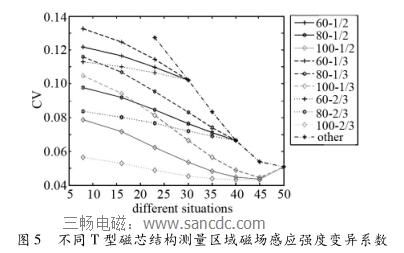 標(biāo)準(zhǔn)差代表磁場(chǎng)測(cè)量區(qū)域的磁場(chǎng)分布波動(dòng)性較大,因而需引入變異系數(shù)對(duì)測(cè)量區(qū)域中的磁場(chǎng)分布情況進(jìn)一步分析。如圖5所示為不同T型磁芯結(jié)構(gòu)下測(cè)量區(qū)域磁場(chǎng)感應(yīng)強(qiáng)度變異系數(shù),圖中橫坐標(biāo)為T型磁芯b的角度,縱坐標(biāo)為測(cè)量區(qū)域磁場(chǎng)強(qiáng)度分布的變異系數(shù),圖標(biāo)圖例與圖3中一致。從仿真結(jié)果可以看出:T型磁芯的較長(zhǎng)端的角度a越小,流量計(jì)測(cè)量區(qū)域中磁場(chǎng)強(qiáng)度變異系數(shù)越大;在T型磁芯的較長(zhǎng)端的角度a一定時(shí),T型磁芯的較短端的角度b越小,流量計(jì)測(cè)量區(qū)域中磁場(chǎng)強(qiáng)度變異系數(shù)越大;在T型磁芯的較長(zhǎng)端的角度a與較短端的角度b一定時(shí),T型磁芯的k1/(k1 + k2)越小,在流量計(jì)測(cè)量區(qū)域中磁場(chǎng)強(qiáng)度變異系數(shù)越大。異系數(shù)越大說(shuō)明磁場(chǎng)分布越不均勻,波動(dòng)性越大;異系數(shù)越小說(shuō)明磁場(chǎng)分布趨向均勻。下面通過(guò)計(jì)算測(cè)量區(qū)域中的磁場(chǎng)均勻區(qū)域來(lái)對(duì)這一結(jié)果進(jìn)一步的分析。