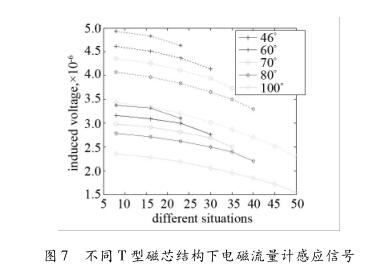 從仿真結(jié)果可以看出:T型磁芯的較長(zhǎng)端的角度a越小,流量計(jì)電極兩端獲得的感應(yīng)信號(hào)越大;在T型磁芯的較長(zhǎng)端的角度a一定時(shí),T型磁芯的較短端的角度b越小,流量計(jì)電極兩端獲得的感應(yīng)信號(hào)越大。這主要是因?yàn)?strong>井水流量計(jì)勵(lì)磁線圈的增加,使得流量計(jì)測(cè)量區(qū)域的磁場(chǎng)強(qiáng)度增加,同樣分布的流速下使得流量計(jì)電極兩端的感應(yīng)信號(hào)增加。
