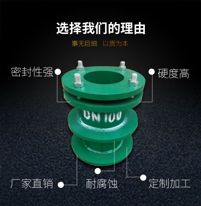 柔性防水套管主要由法蘭套管、密封圈、法蘭蓋、螺栓、螺母、鋼管、擋板等材料組成。法蘭壓蓋主要用于固定和擠壓防水橡膠密封圈。柔性防水套管主要用于密封和防水。密封條主要通過螺栓將壓蓋與防水套管本體緊密連接。主要適用于要求、承受管道振動和伸縮變形、防水要求嚴格的建筑物墻體。柔性防水套管可分為A型和B型。